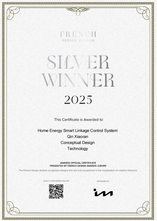 近日,国际知名设计大奖——French Design Awards 2025(法国设计奖)正式公布获奖名单。电车充电桩领域资深技术研发专家秦晓然女士研发的“家庭能源智慧联动控制系统”凭借其创新设计与技术整合,在众多国际参赛作品中脱颖而出,成功斩获2025法国设计奖银奖,获得国际权威认可。