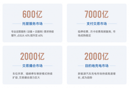 停车场托管服务年增长率从40%向60%不断提升,达到600亿市场;7000亿的停车支付业务如临停收费、月卡业务等具有高频、稳定特点,现金流健康;2000亿共享停车、错峰停车市场,创新模式不断落地,进一步拓展市场边界。此外,新能源汽车爆发式增长带动充电桩需求急速上升,目的地充电市场已成为新的增长引擎,迈入2000亿市场。选择停车,就是选择一个高速增长的黄金赛道。