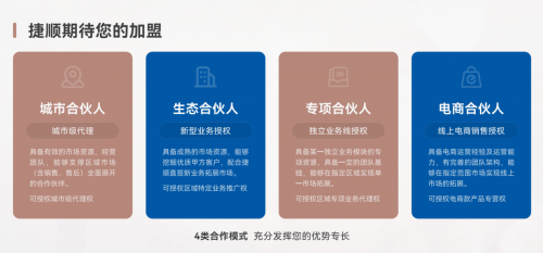 城市合伙人、生态合伙人、专项合伙人、电商合伙人……只要您有资源、有想法、愿意行动,捷顺即为您量身定制合作路径,携手共赢。