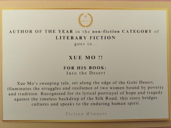 (洛杉矶时间)2025年10月4日,中国作家雪漠的英文版作品《沙漠的女儿》(“Into the Desert”)由国际著名汉学家葛浩文和林丽君联合编译,荣获2025年“国际影响力年度作家奖”(INTERNATIOAL IMAPCT BOOK AWARDS -AUTHOR OF THIS YEAR 2025 ),入选“文学小说”类别。