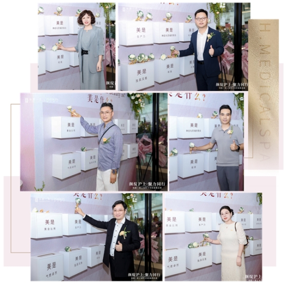 和颜一美轻医美连锁品牌创始人/CEO张伍新、芙艾医疗联合创始人/董事长兼CEO黄侃、艾尔建美学中国市场执行总监田琳、艾尔建美学东中国销售执行总监姚悦、高德美南中国总监Tina、科医人中国区副总经理兼客户服务部总经理张磊 等领导嘉宾、合作伙伴齐聚一堂,共同见证了这一荣耀时刻。活动伊始,一场别开生面的鲜花签到仪式拉开了序幕,嘉宾们手持鲜花,将对美的理解融入万象美学格中,定格这份美好初印象。
