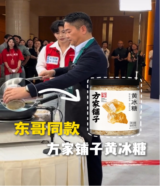 9 月 16 日,京东集团创始人、董事局主席刘强东现身“京东旅行”直播间,重启“用户见面会”,身着围裙亲手烹制宿迁名菜“黄狗猪头肉”,从炒糖色到收汁装盘,娴熟动作里满是对家乡味道的珍视。这场直播不仅让这道传承 300 余年的非遗菜肴火遍全网,更让一个细节走进大众视野:刘强东炒糖色、增香提鲜时用的,正是来自中华老字号方家铺子的黄冰糖。