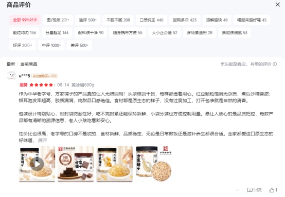 这份对“本味”的执着,早已让方家铺子黄冰糖成为消费者厨房里的“老熟人”。据京东平台数据显示,该产品年销量超 12 万瓶,2022-2024 年连续三年蝉联京东黄冰糖品类销售额第一,累计好评率高达 99%。在京东用户评价里,满是真实的认可:有妈妈坚持用它给女儿熬秋梨膏,锁住自然清甜;有年轻人靠它第一次做出不苦的红烧肉,兴奋地分享成功喜悦;还有老顾客留言“从杂粮到干货无限回购,食材原生态、无过度加工,打开包装就是自然清香”,连密封袋防潮、小袋分装控量的细节设计,都被频频点赞。